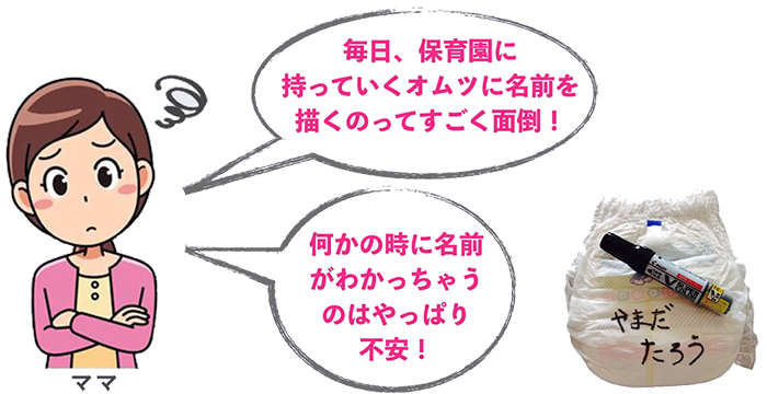 おむつにオリジナルのオウンマークを貼れば、緊急時、お母さんへの連絡もすぐに取る事ができます。